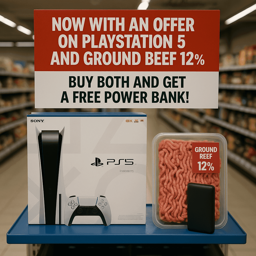Jag längtar tills Elgiganten börjar med köttfärs. “Nu med erbjudande på Playstation 6 och nötfärs 12% – köp båda och få en gratis powerbank!”